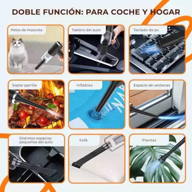 Este aspirador portátil no solo se puede utilizar como aspirador para la limpieza diaria de casas y automóviles. También tiene función de soplado que sirve para hinchar colchones, flotadores de gran tamaño o inflar globos para una fiesta de cumpleaños.